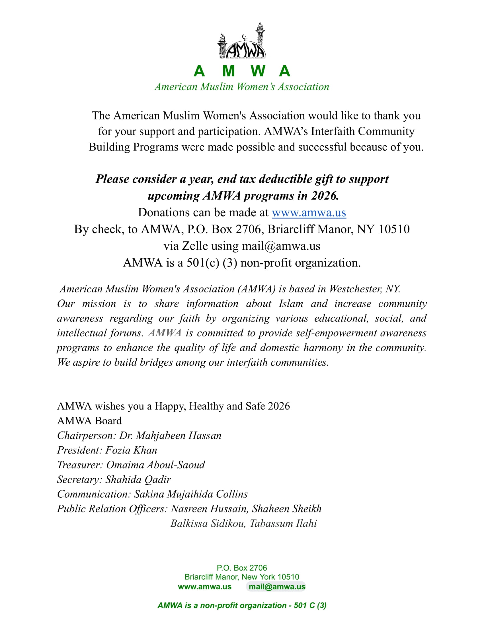 Earmarked for social studies teachers and is held during the annual NY Public School S. S. Teachers Conferences. AMWA provides qualified speakers to increase the teacher’s awareness and understanding about Islam and its diverse culture, to enrich the teacher’s teaching strategies and increase cultural sensitivity. AMWA also provides educational resource materials.
