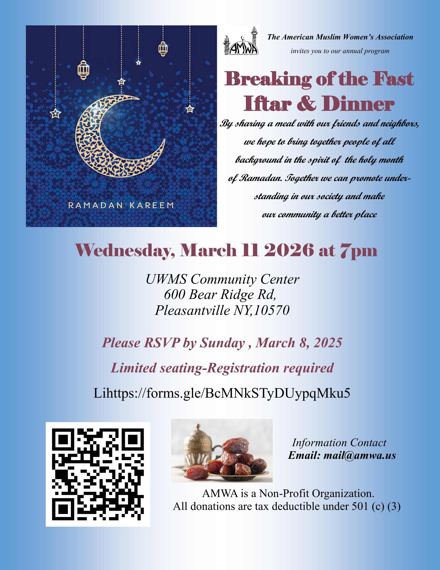 Please consider a year end tax deductible gift to support AMWA programs and projects.American Muslim Women’s Association also accepts Zakah.